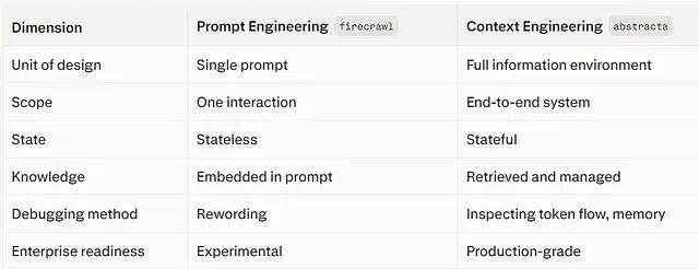 Prompt Engineering 按请求生效,无状态,优化的是单次输入-输出对。对于起草邮件、生成摘要、一次性格式转换这类任务,它就是正确的工具。一旦任务要求模型调用工具、追踪状态或跨步骤协作,单靠 Prompt 撑不住整个系统。