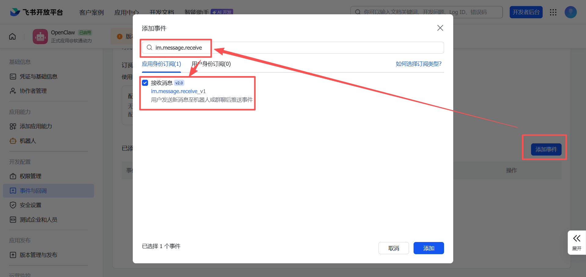 点击下面“添加事件”,搜索:im.message.receive,勾选接收消息事件,然后点击“添加”。