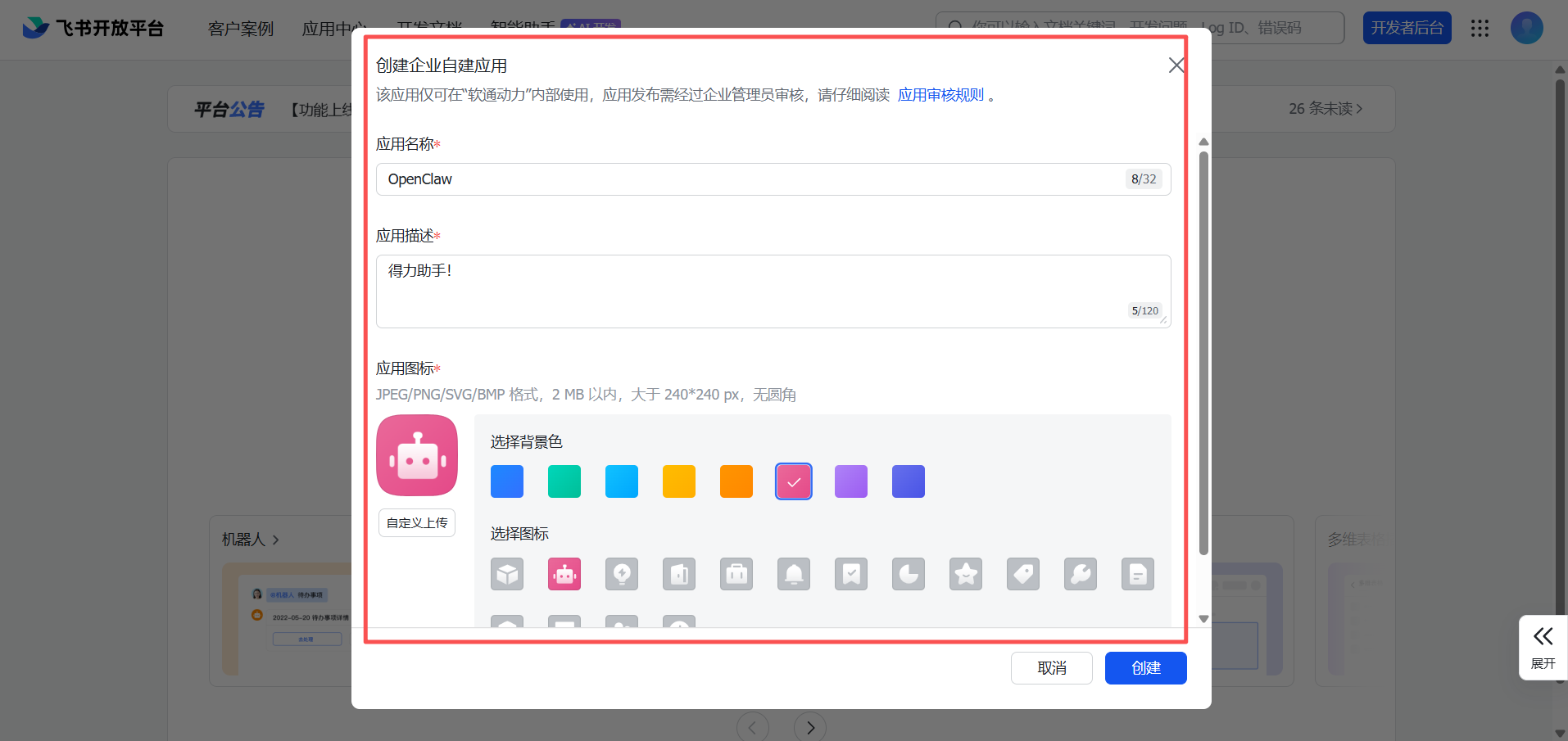 填写应用名称、说明,并选择应用图标的背景色和图标,点击创建