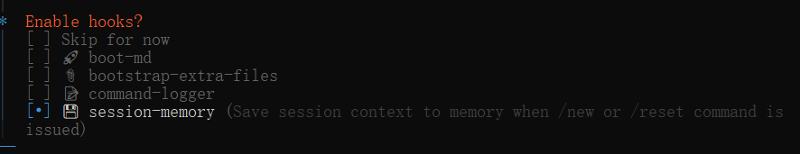 Enable hooks? 可选的钩子,钩子是 OpenClaw 在消息处理流程中可以插入的自定义逻辑,例如处理 Markdown、加载额外文件、记录命令、会话记忆等,选session-memory