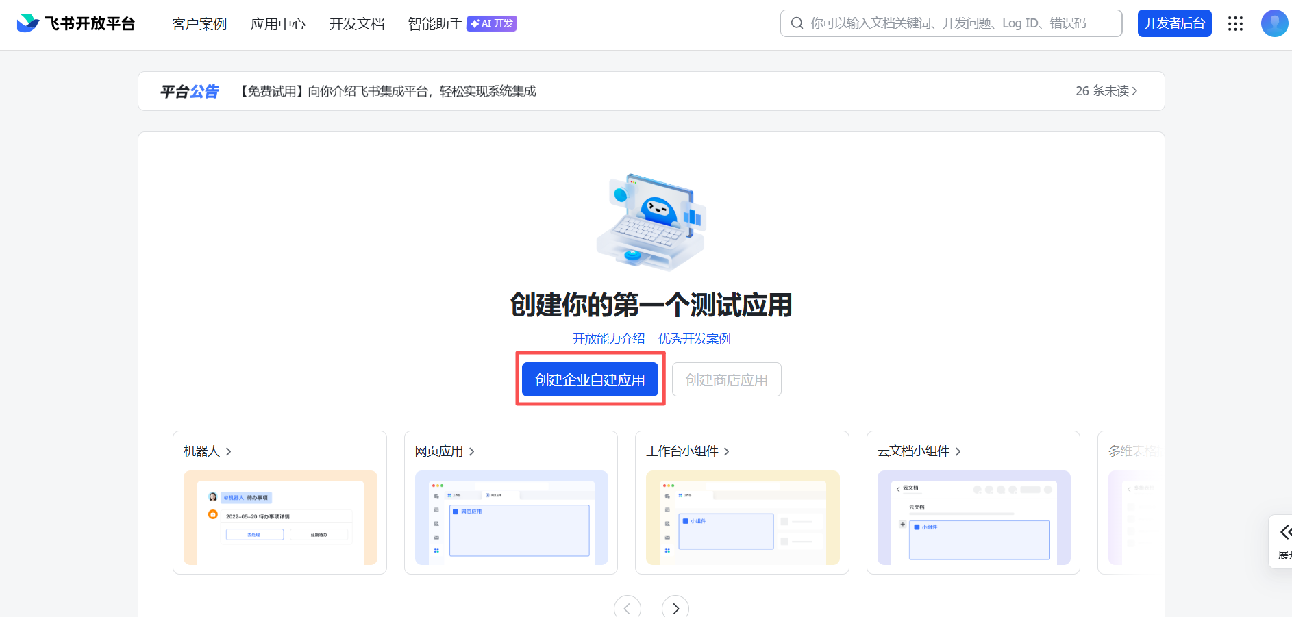 打开 https://open.feishu.cn/app,创建应用