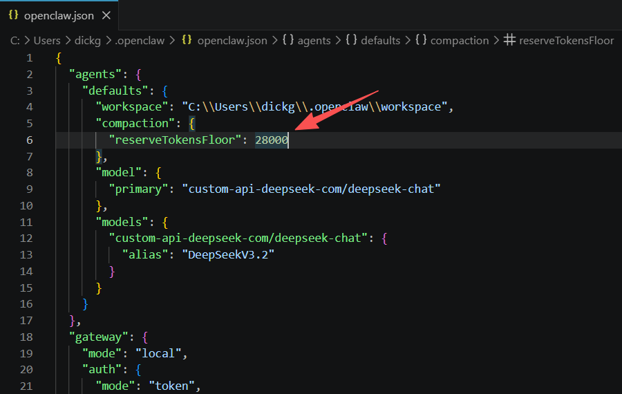 编辑~/.openclaw/openclaw.json增加配置reserveTokensFloor,设置为28000,修改models里的contextWindow为190000,maxTokens为128000: