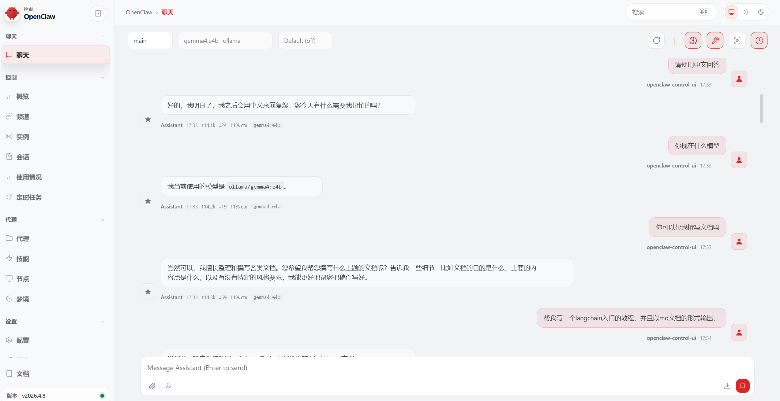 如果有显卡显存6G+16G内存电脑可以推荐e4b,如果有更好的配置更推荐e26b,模型能力更强,这里我所使用的是e4b,用来进行体验OpenClaw完全足够了,如果想让他帮你干事的话,就需要去使用云端大模型了。