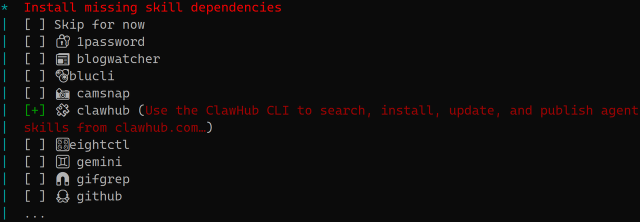 下图是列出了可以直接添加的技能,推荐安装clawhub,这是 OpenClaw 的官方技能库管理器,有了它,以后可以直接在飞书里输入 /install [新技能]。
