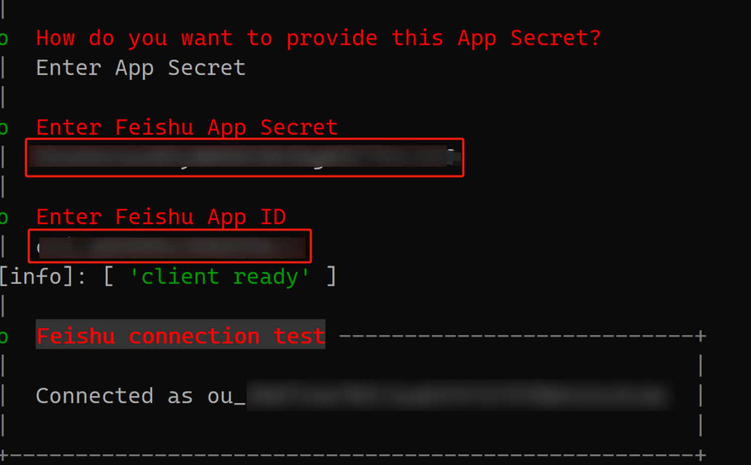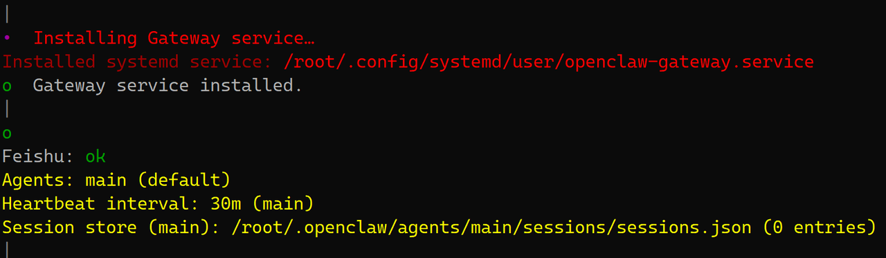 含义:在当前的命令行(Terminal User Interface)里直接运行初始化。这是最直观的。你可以直接在终端看到实时的运行日志(Logs),如果飞书 API 报错或者 Token 无效,报错信息会立刻刷出来。