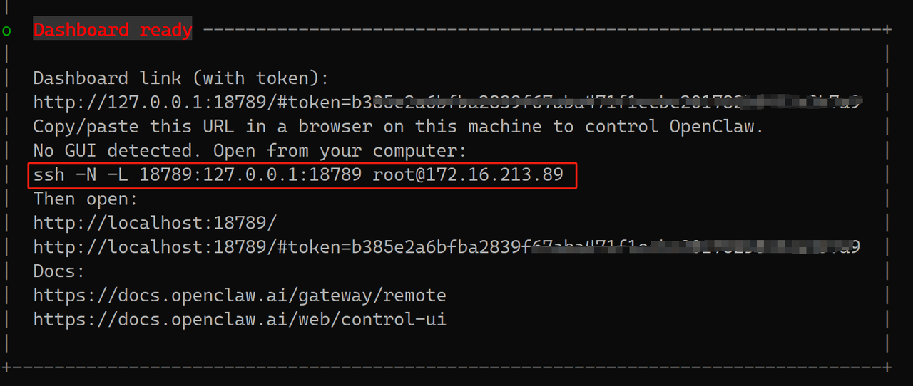 ssh -N -L...命令并保持窗口别关。最后,在浏览器里直接复制粘贴最下面那行带 Token 的链接:http://127.0.0.1:18789/#token=b385e2a6bfxxxxx39f67aba471f1ecbc201782b8432a3b7a9
