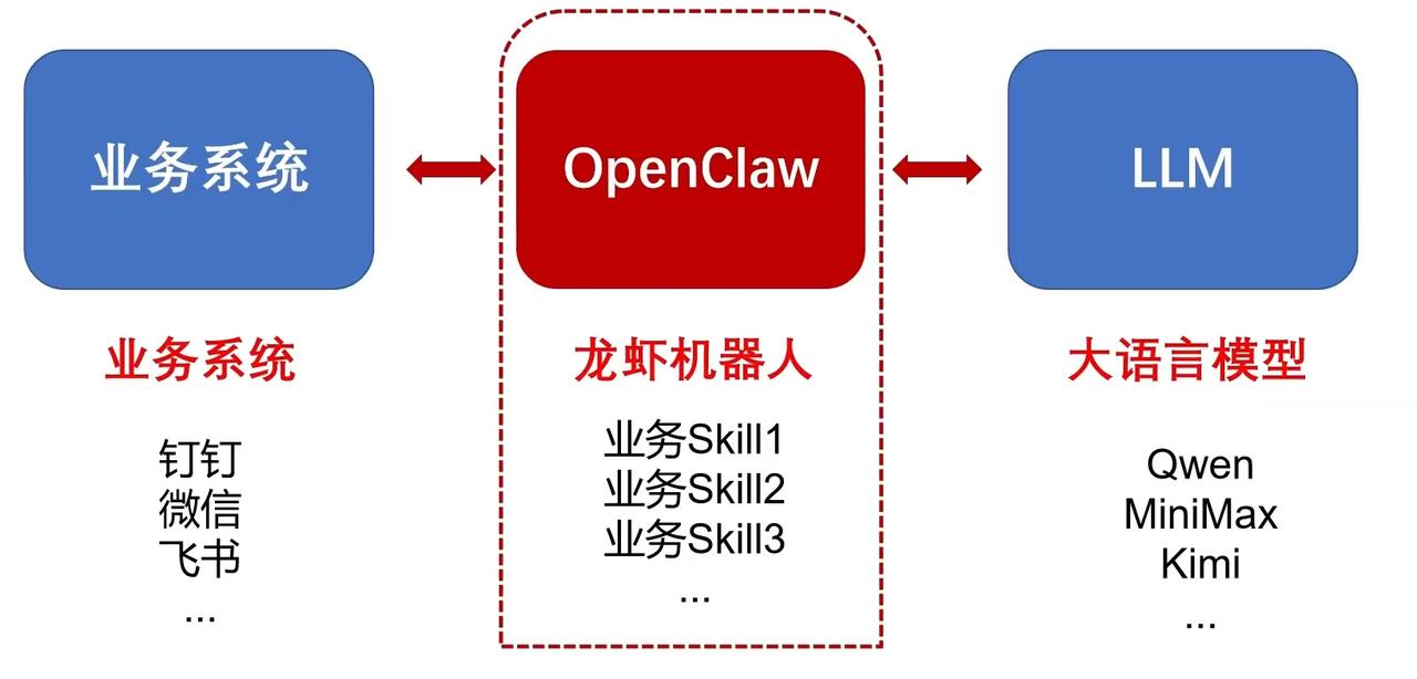 OpenClaw 负责识别用户的意图,并调用相应的 Skill,再配合 LLM 的推理能力来完成具体任务。它解决了通用大模型“不懂具体业务规则”的痛点。