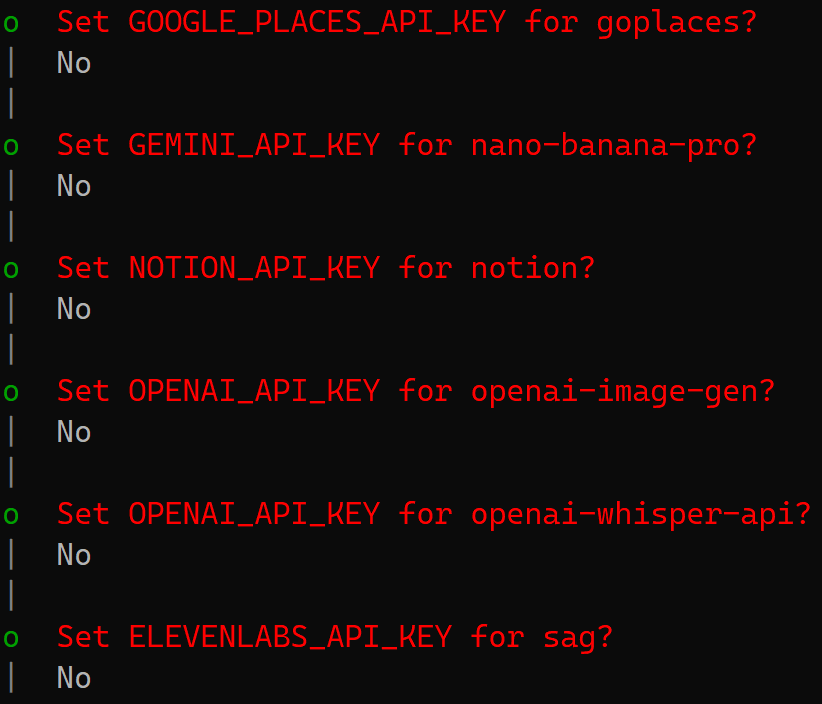 下面这些步骤都是OpenClaw 插件的特定功能密钥,可暂不配置,都选择NO,这些辅助功能以后随时可以在 openclaw.json 里补上。