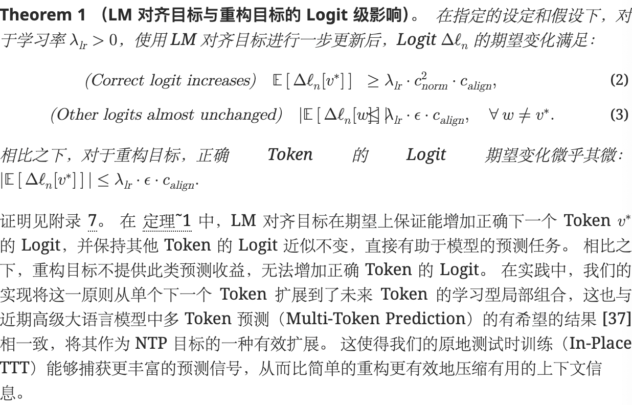 将 TTT 通用的重构目标替换为一个量身定制、理论扎实的目标,该目标与控制自回归语言建模的“下一个 Token 预测”任务明确对齐。 这一原则性目标结合高效的块级更新机制,产生了一种与上下文并行计算兼容且高度可扩展的算法。