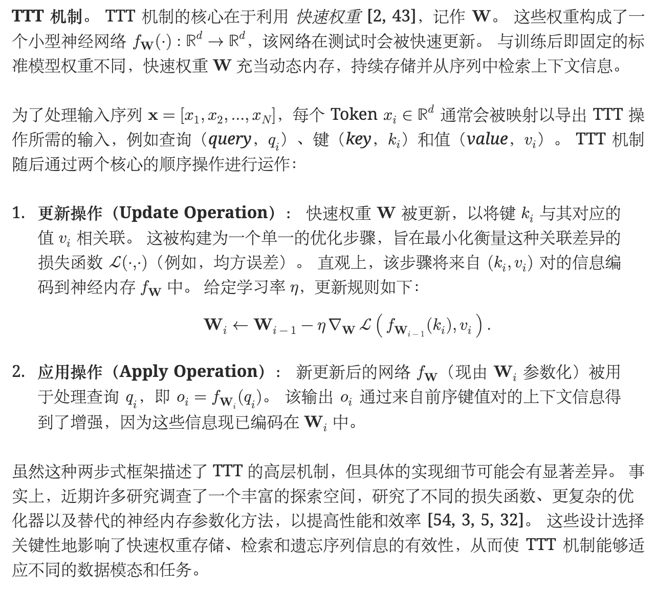 更新完参数后,使用新的 Wi 来处理当前 token 的查询 qi:oi=fWi(qi)这个输出 oi 就是融合了历史上下文信息的当前 token 的表示。它将被用于后续任务(如语言模型的下一个token预测)。