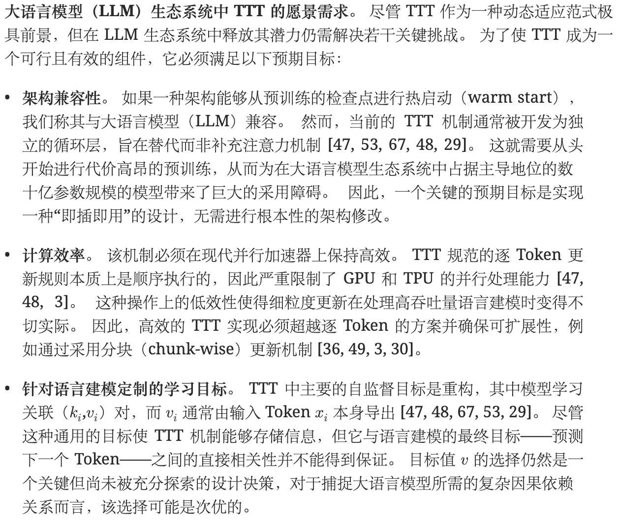 第一,很多 TTT 方法是单独设计的新层,甚至想替换 attention,这意味着很难从现成大模型 checkpoint 直接 warm-start,通常得从头预训练。