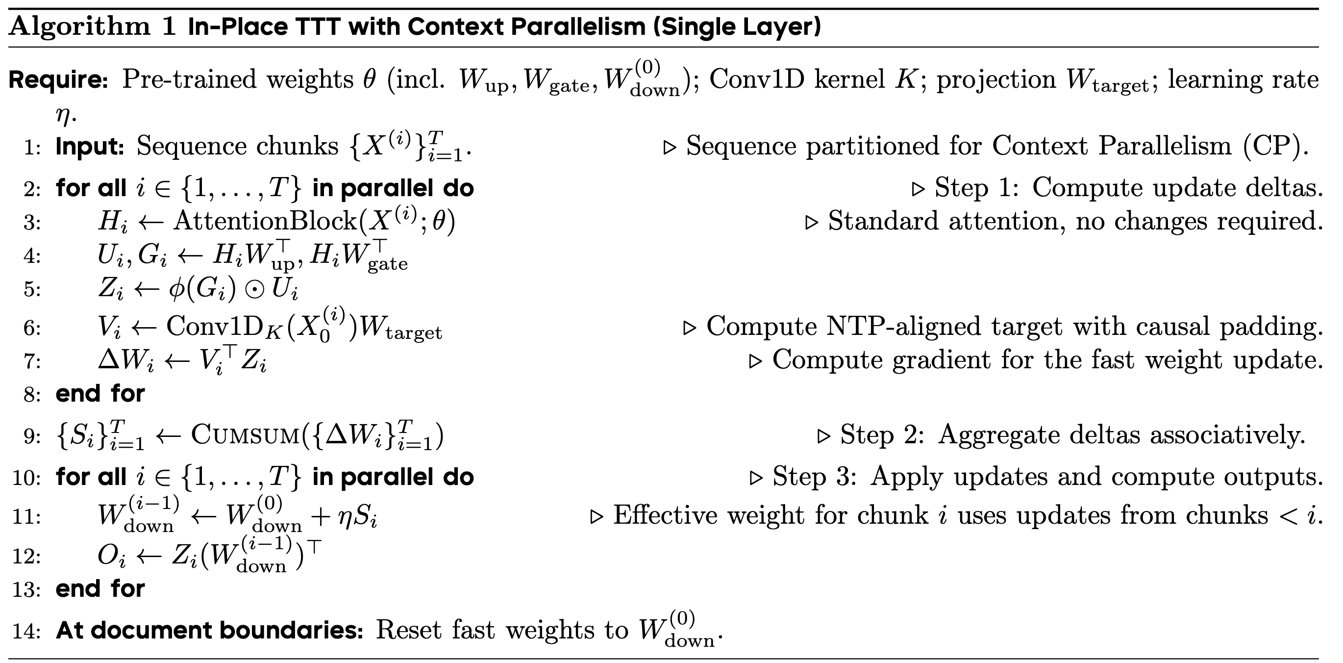 所以它本质上是一个严格因果的 apply-then-update 机制。论文 Figure 1 就是在画这个循环:attention 不动,进入 MLP 后先切 chunk,再对每个 chunk 执行 apply,再根据 chunk 的目标值产生 ΔW(i) 去更新 Wdown。