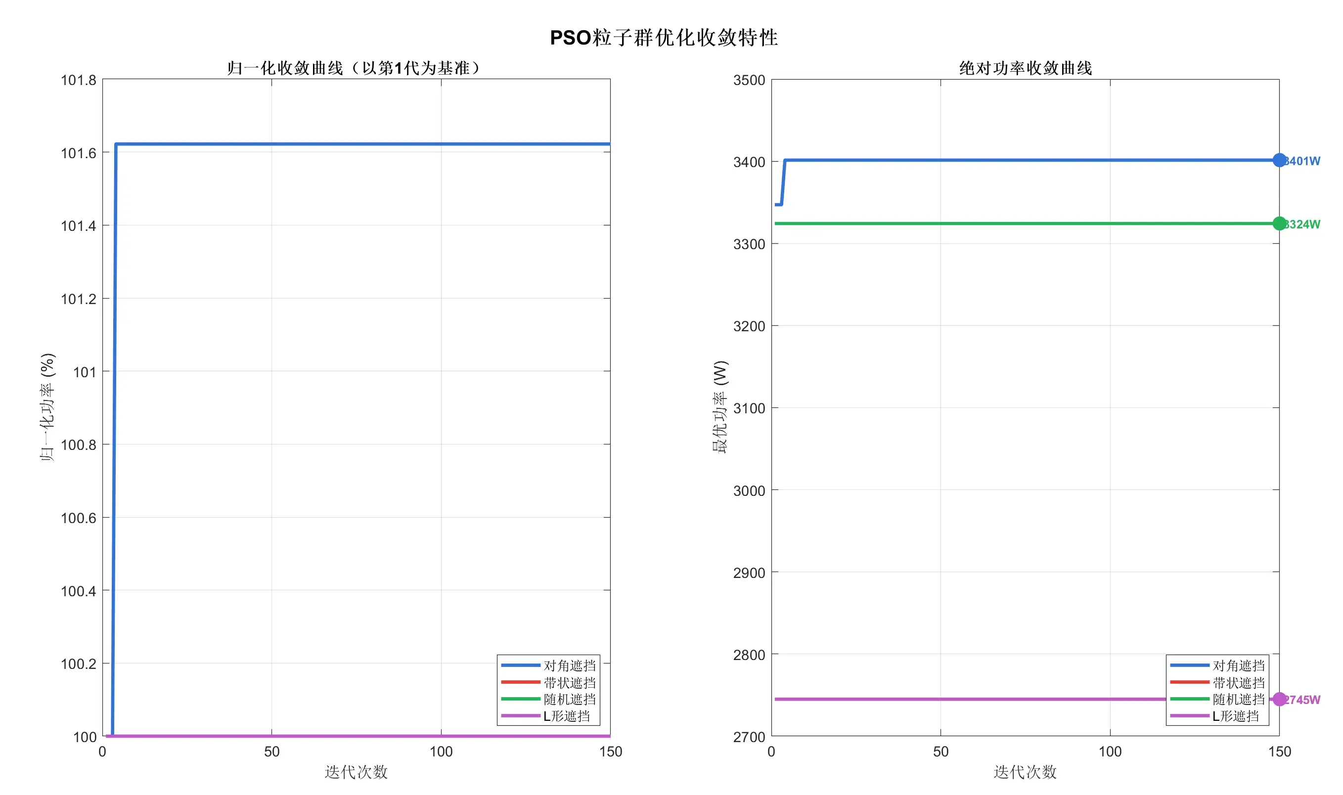 - 设计的离散 PSO 算法框架(整数排列编码、swap 操作速度更新、自适应惯性权重)适配光伏组件重分配的离散优化特性,算法收敛效率高、鲁棒性强,在带状遮挡场景下收敛至理论最优解,验证了算法的合理性;