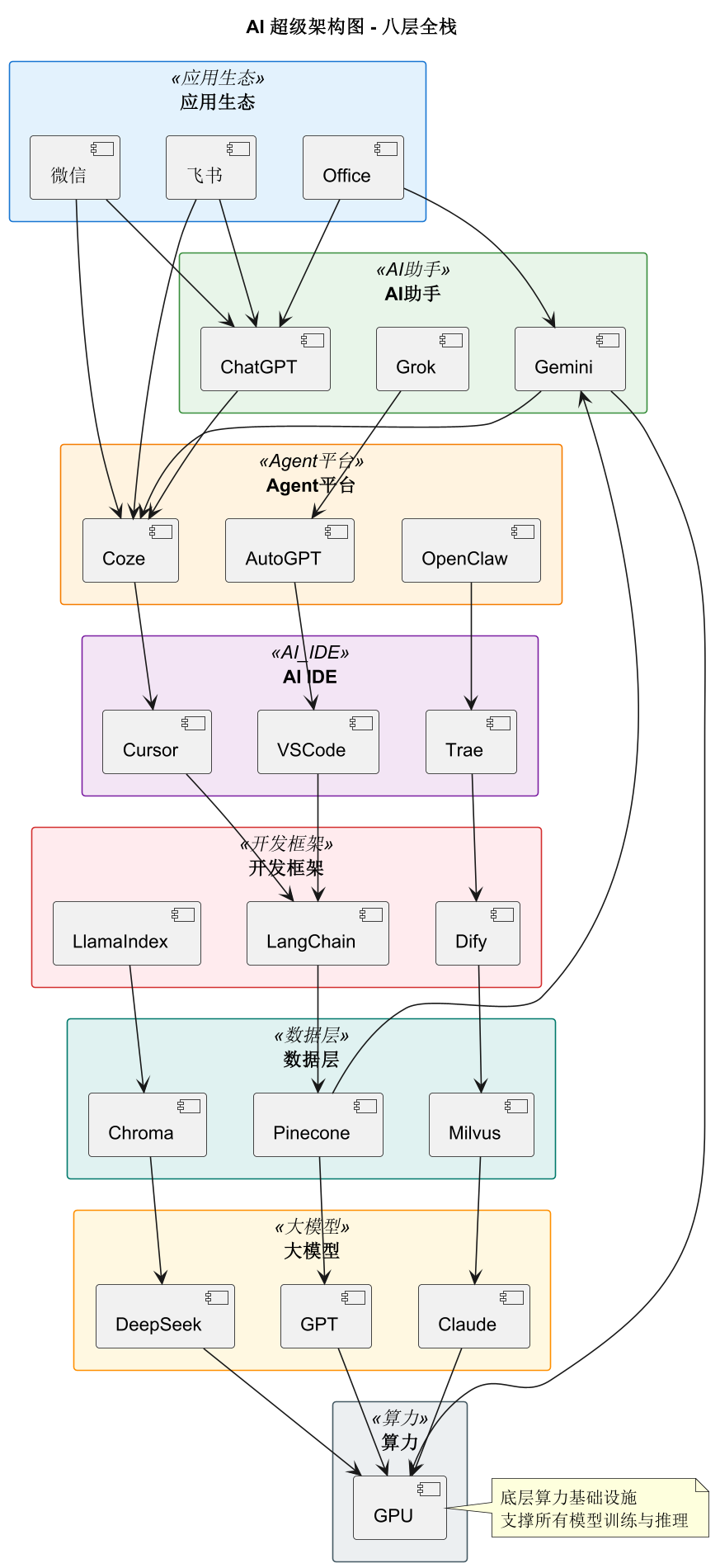 算力 → 模型 → 数据 → AI开发框架 → AI IDE → Agent平台 → 应用生态