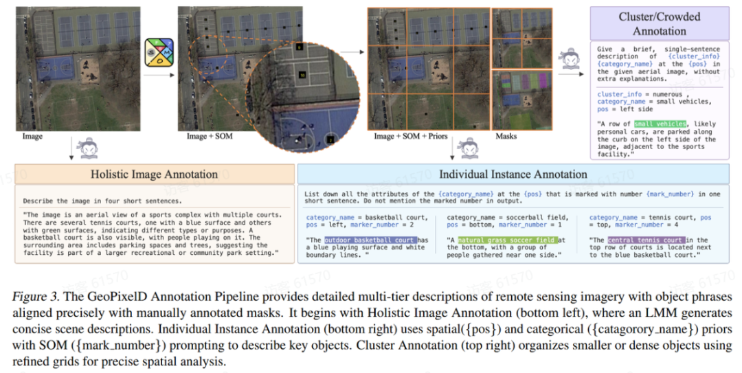 任务描述:输入高分辨率遥感图像,模型生成一段详细的自然语言描述,并在描述中交织多个目标物体的分割掩码。模型能根据物体尺度和密度,自适应选择实例掩码(针对大而分散的物体)或语义掩码(针对小而密集的物体集群)。