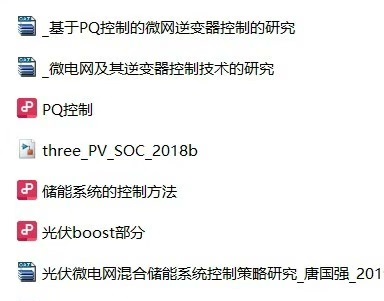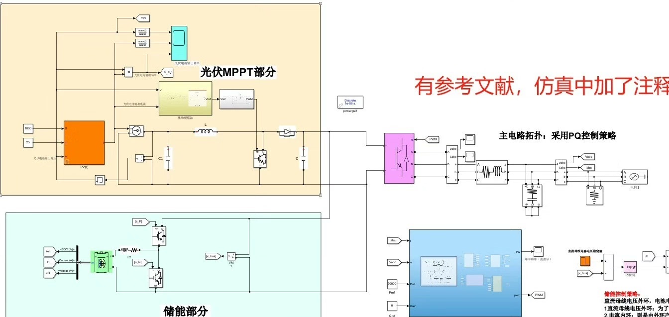 光伏储能三相PQ恒功率并网控制仿真(附参考文献及文档) ①网侧:采用PQ恒功率控制,参考文献《_微电网及其逆变器控制技术的研究》 ②储能控制:直流母线电压外环,电池电流内环双闭环控制策略直流母线电压外环:为了稳定Vbus在设定电压值 电流内环:则是由外环产生的电流信号控制电池充放电电流 ③光伏Boost:光伏板参考文献搭建的光伏电池模型,MPPT算法采用经典的扰动观察法,可以更换其他算法,在功率等级差不多的情况下只需调光伏模块即可