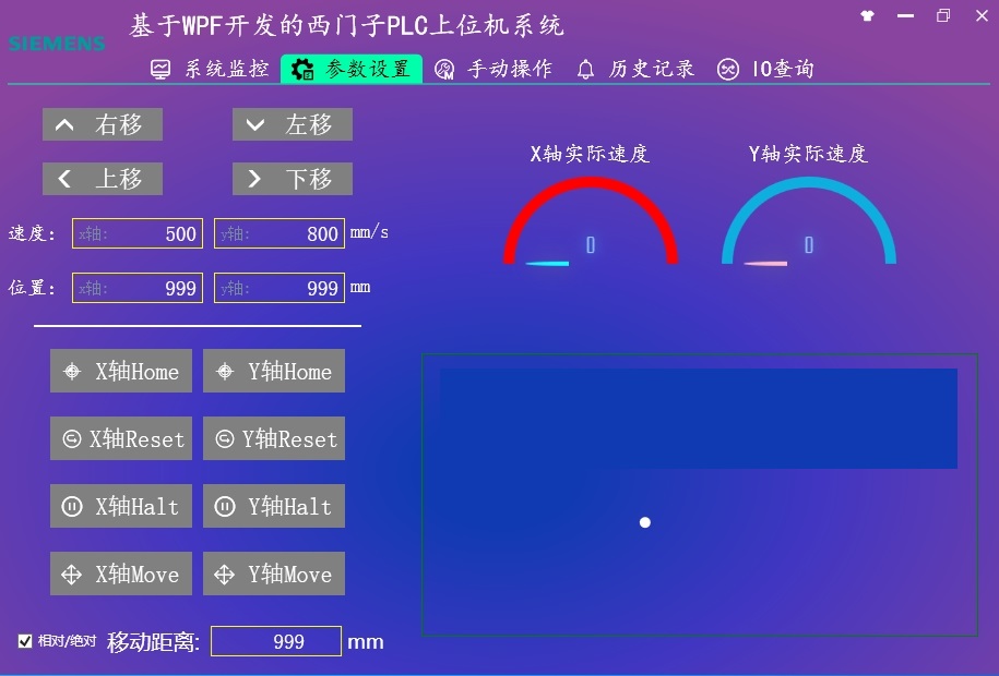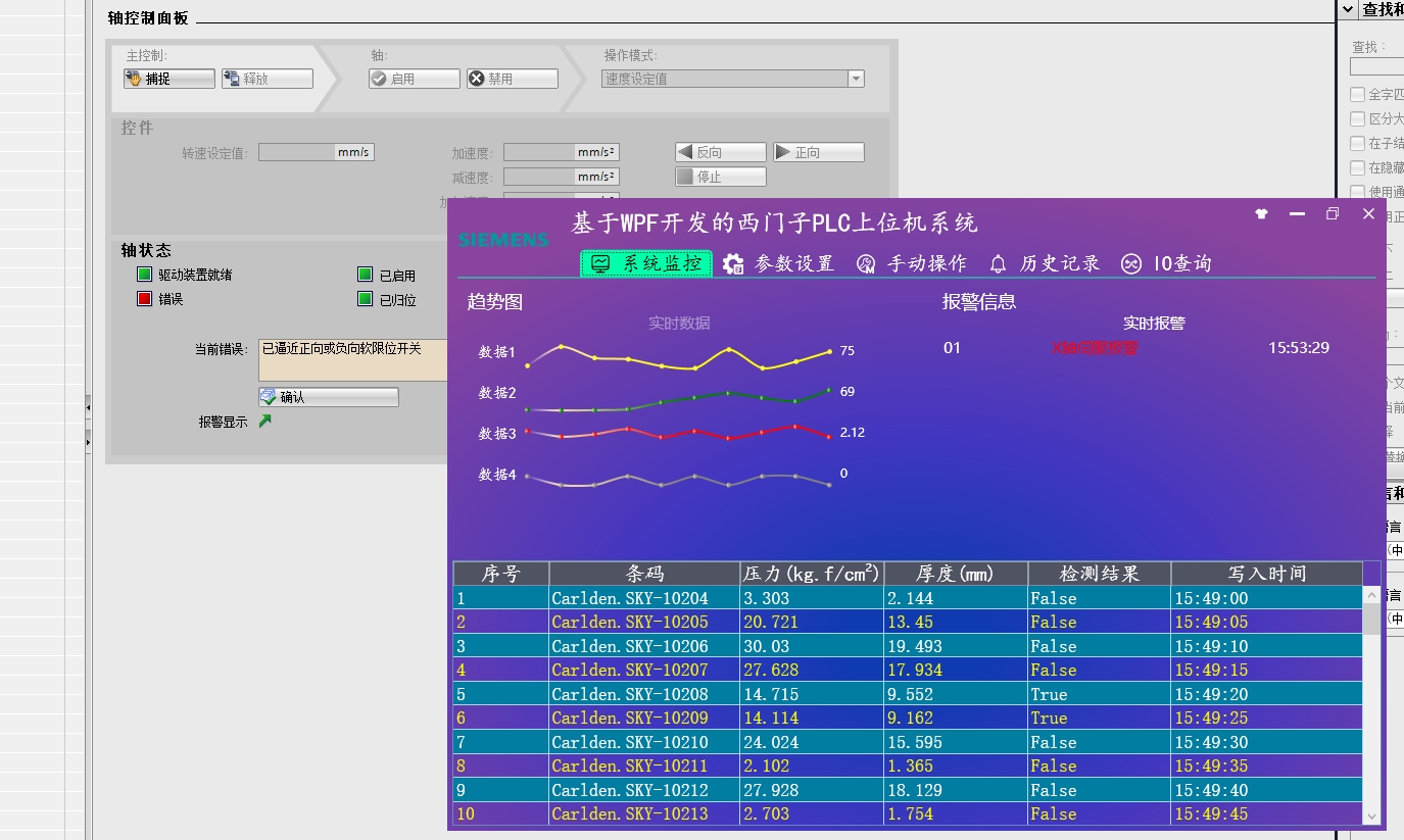 采用C#WPF语言设计的上位机,与西门子plc通讯,采用MVVMLight框架。 实时显示报警信息,实时趋势图显示,生产数据自动保存到数据库。 实现伺服控制,手动IO控制。