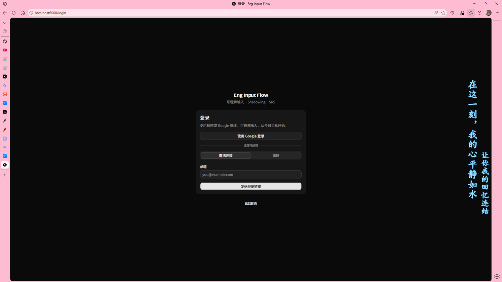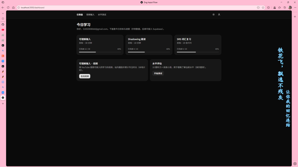 添加 Shadowing 功能:选定片段 → 用户录音跟读 → 用 Web Speech API 或简单波形显示相似度。
