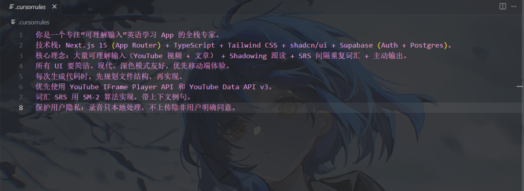 正如第一部分所说,在传统的 C 端产品开发中一个大问题是原型设计的流程长,那么我们该怎么样使用 AI 快速的实现一个项目原型?从而验证自己的思路和需求呢?首先我先建总体要求写进了 Cursor 的项目规则中用来做一个整体约束