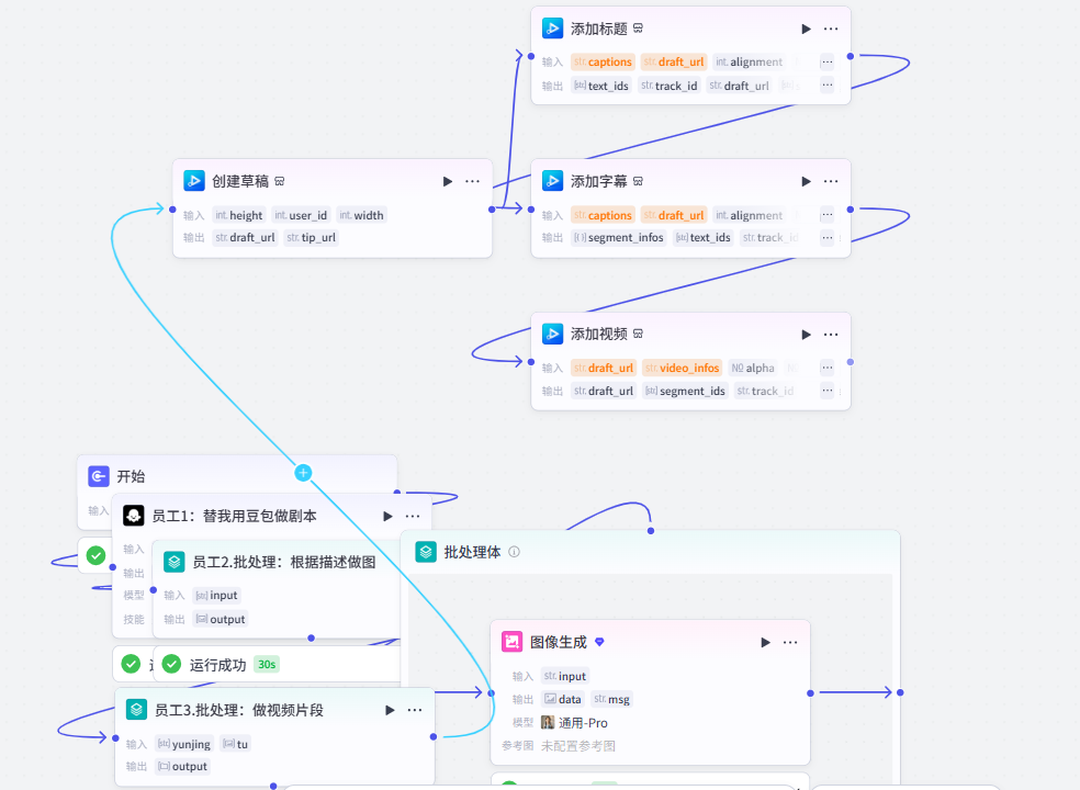分别把create_draft命名为创建草稿,add_captions命名为添加标题,add_captions_1命名为添加字幕,add_videos命名为添加视频。然后把员工3与创建草稿连接,创建草稿与添加标题连接,添加标题与添加字幕连接,添加字幕与添加视频连接