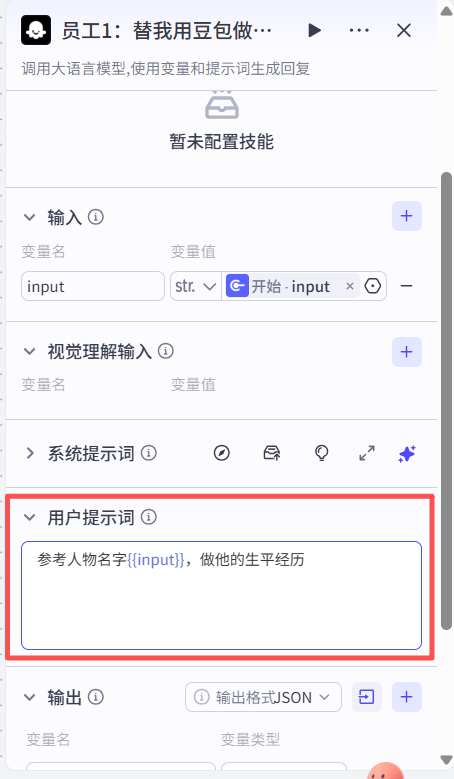 接着在输出那一块,点击右边+号增加3个变量,总共4个变量,对应上面系统提示词里的4个员工技能