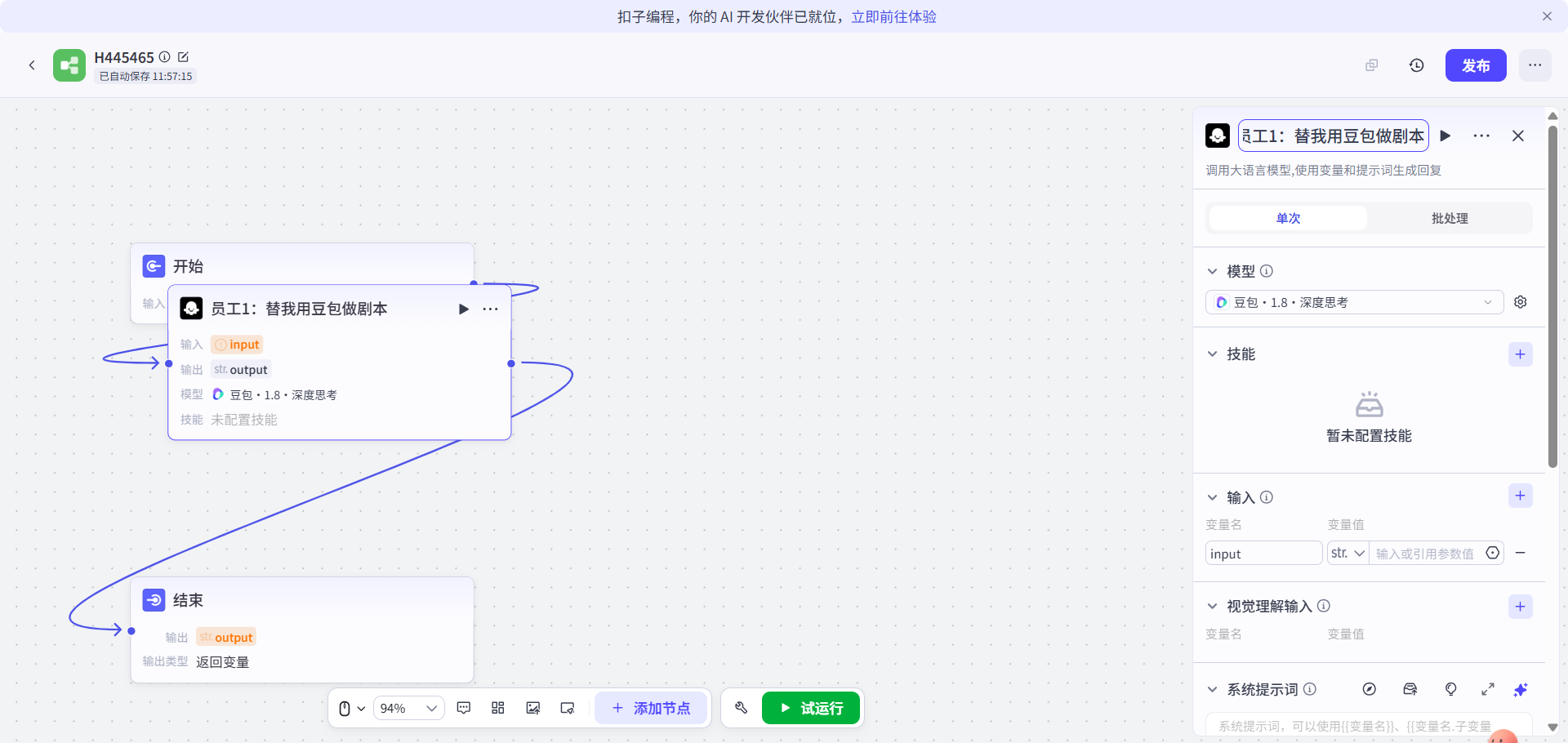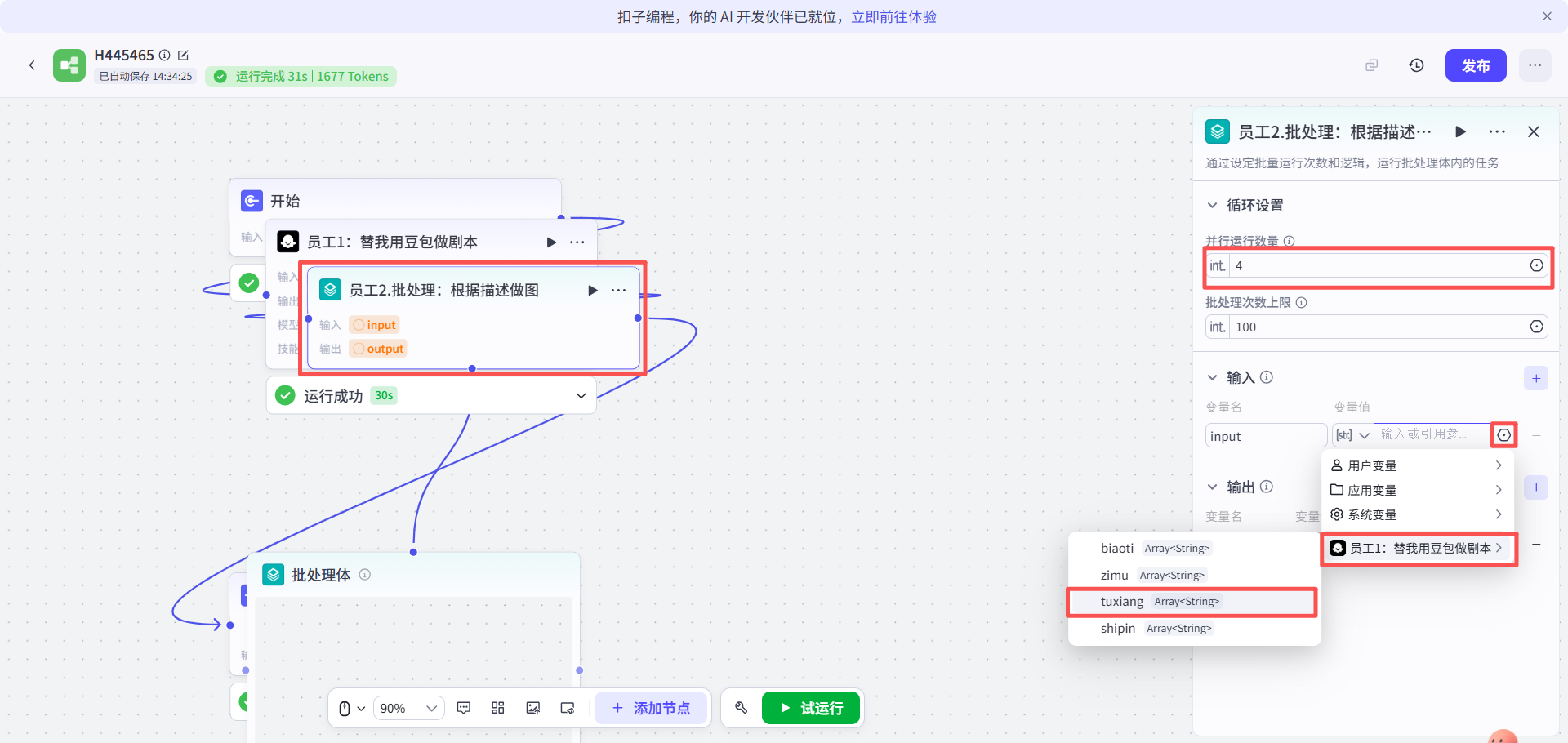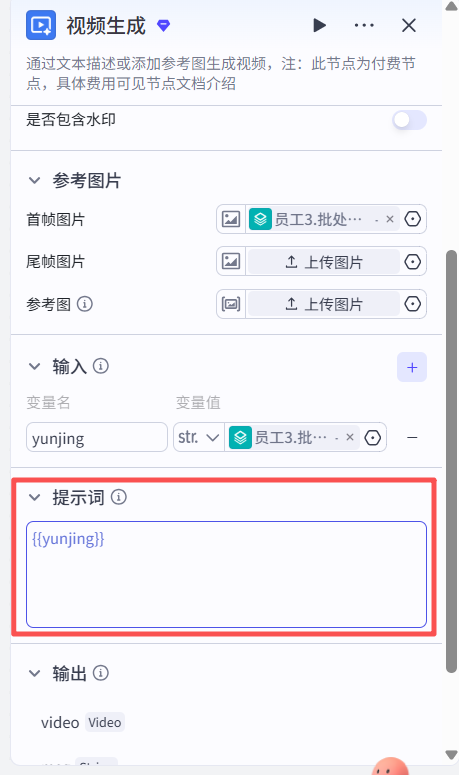 回来再点击员工3,输出的output变量指向设置为“视频生成”节点的video变量