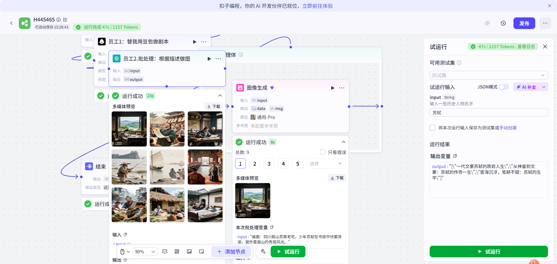 员工2搭建完毕。点击“试运行”,输入“苏轼”。运行结果如下