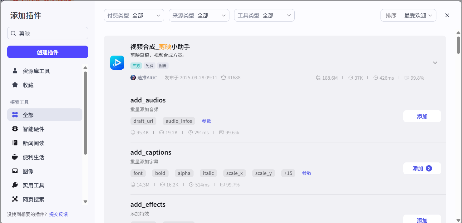搜索“剪映”插件,点击“视频合成_剪映小助手”