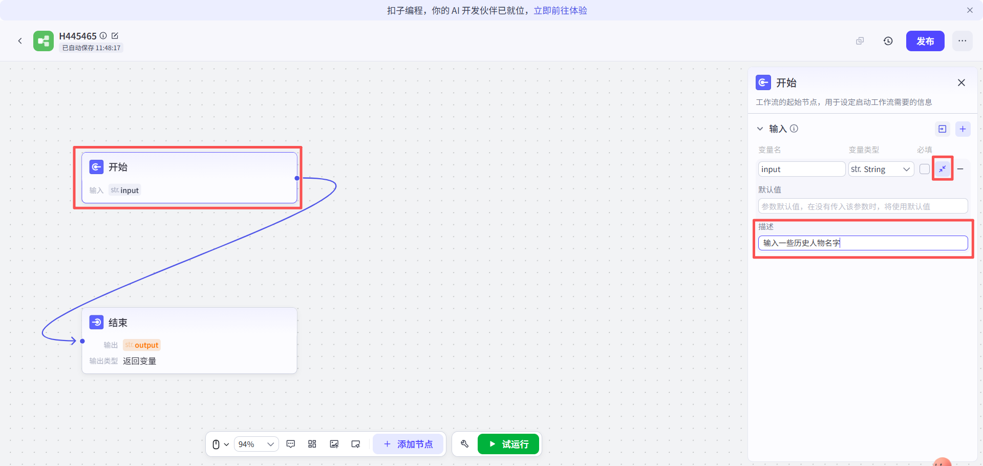 接着点击“结束”节点,在右边编辑框内给名为output的输出变量设置对应变量为biaoti