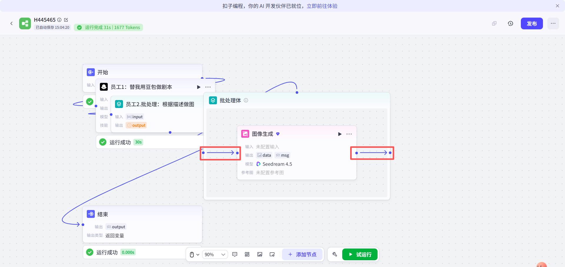 再把添加视频节点与结束节点连接起来。试运行一下。
