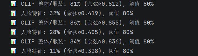 CLIP能判断“整体像不像”,但它对人脸的敏感度不够精细。两张图如果服装一致、体型一致,但脸完全不同,CLIP可能还是会给出较高的相似度。