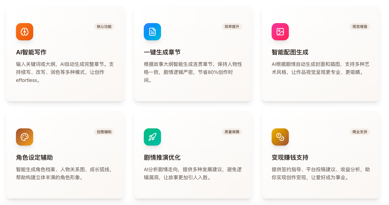 工具核心功能覆盖创作全场景,全程AI辅助,兼顾效率与质量,具体如下: