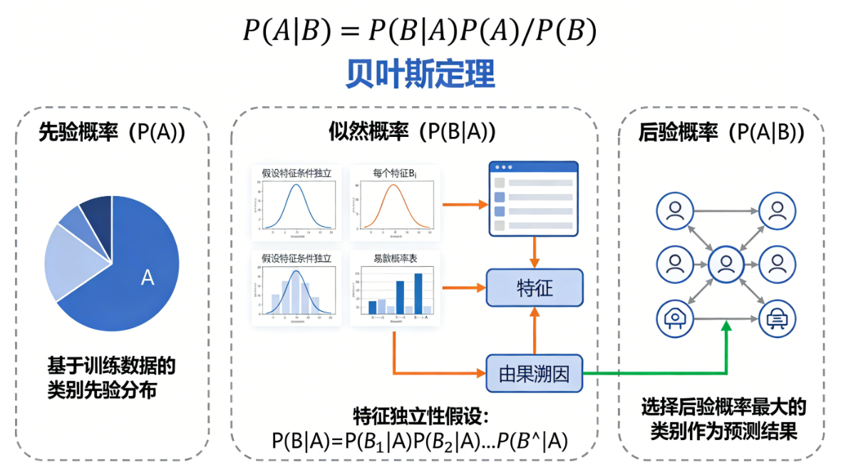 朴素贝叶斯:朴素贝叶斯是一种基于贝叶斯定理的简单高效分类算法,它假设特征之间相互独立(即“朴素”),通过计算后验概率来预测样本最可能属于的类别。