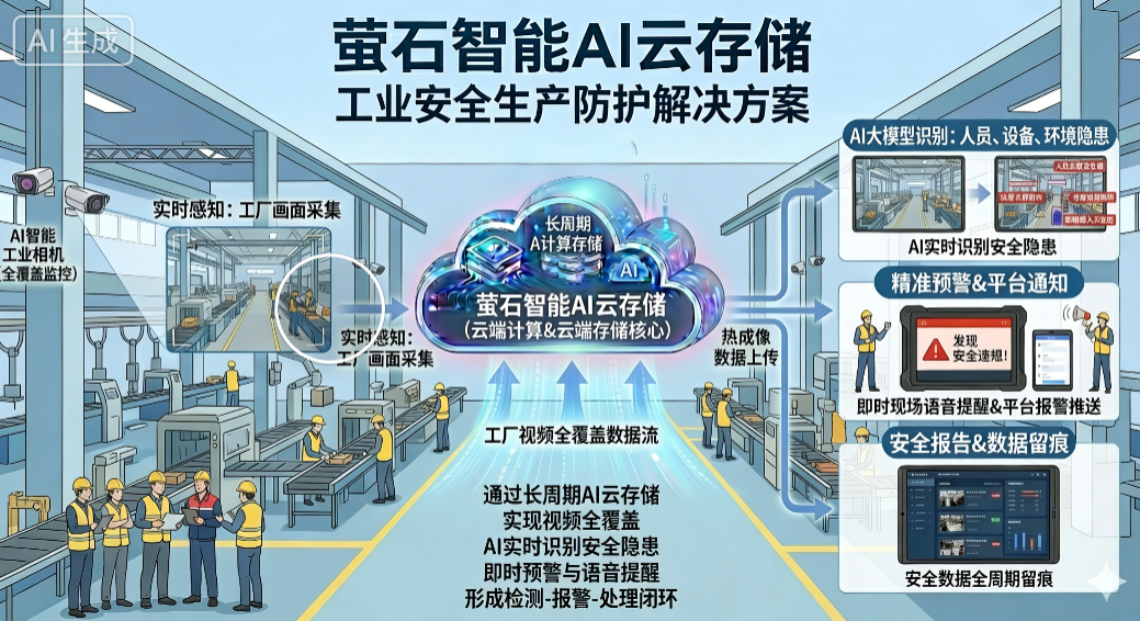 通过长周期智能AI云存储,工业生产场景可实现视频全覆盖,AI实时识别人员、设备、环境安全隐患,发现问题立即触发现场语音提醒与平台报警,形成检测-报警-处理闭环,实现安全可控。