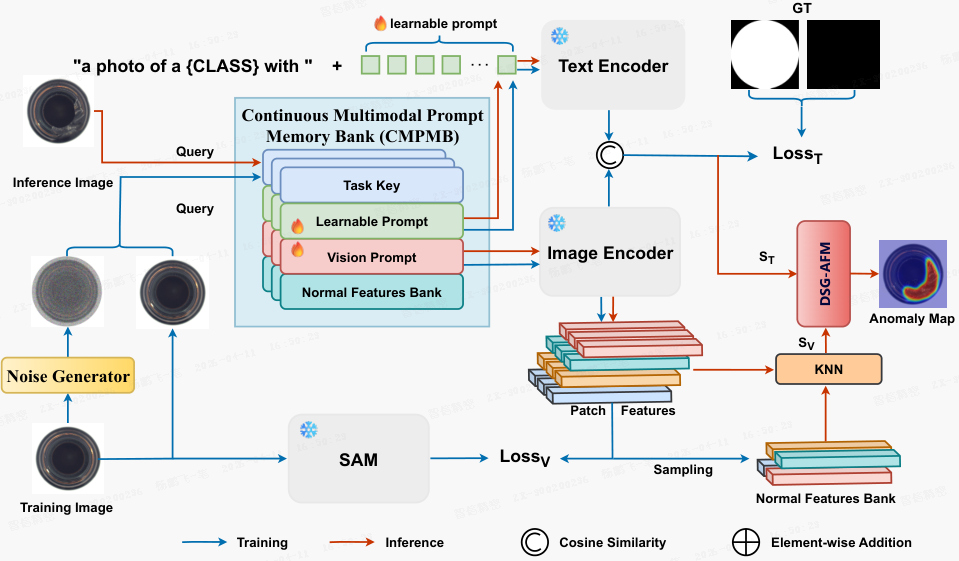 该方法包含一个连续多模态提示记忆库(CMPMB),并设计基于缺陷语义引导的自适应融合机制(DSG-AFM),以提升异常定位能力。