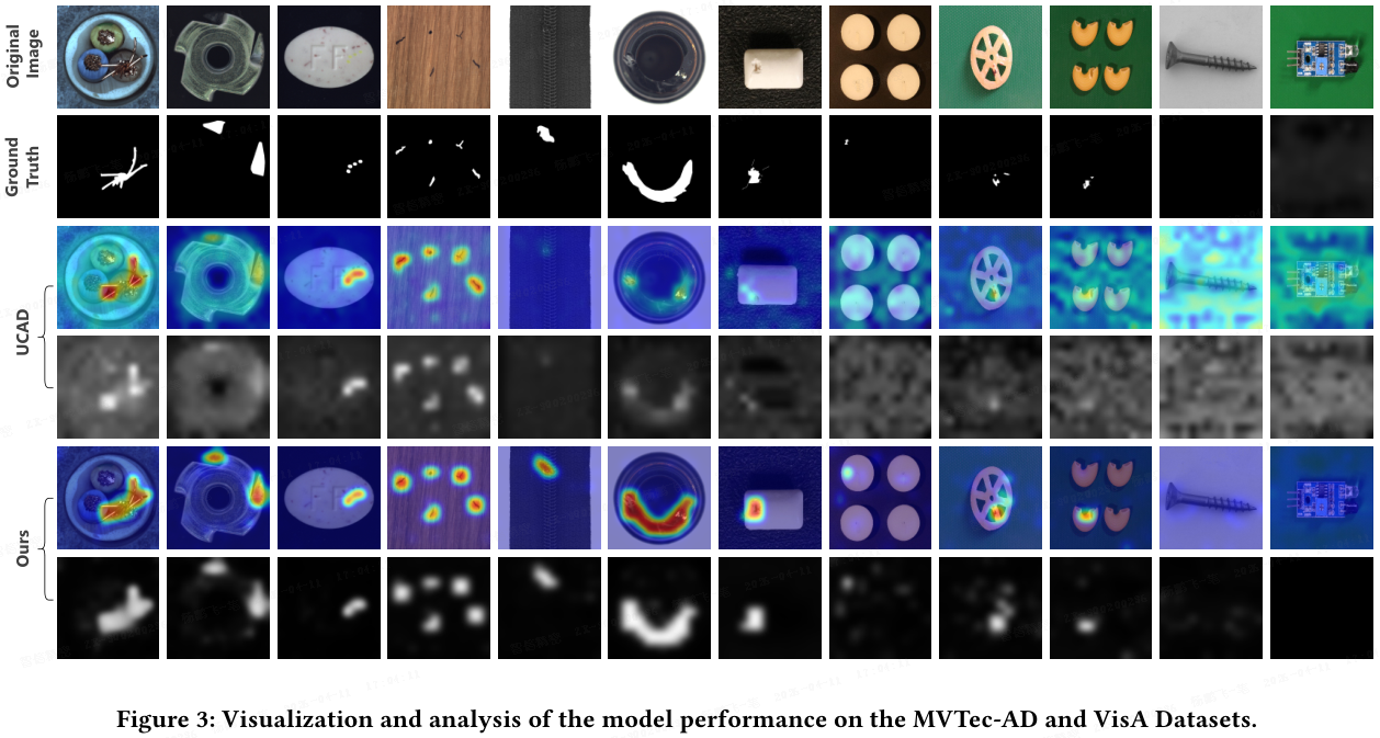 - 与 UCAD 相比,本文方法在图像级 AUROC 上提高了 3%,在像素级 AUPR 上提高了 13%。