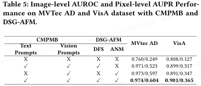 同时使用 CMPMB 和完整 DSG-AFM 时,模型在 MVTec AD 上达到 0.974/0.604(图像级 AUROC/像素级 AUPR),在 VisA 上达到 0.901/0.365,为最佳配置。