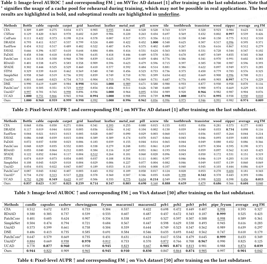 - PatchCore* 和 UniAD* 分别是基于记忆库的 PatchCore 和统一范式 UniAD 的增强版本,用于模拟基于重放的连续异常检测。