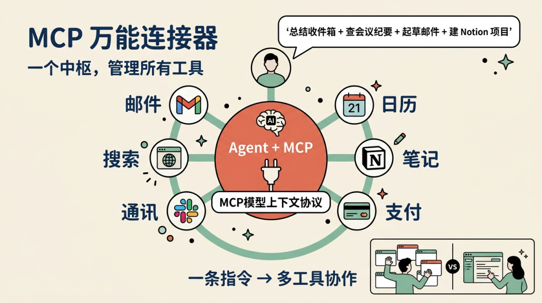 有了 MCP,Agent 只需要说"英语",MCP 会自动翻译成每个工具能理解的格式,再把工具的回复翻译回来。一个中枢,管理所有工具。