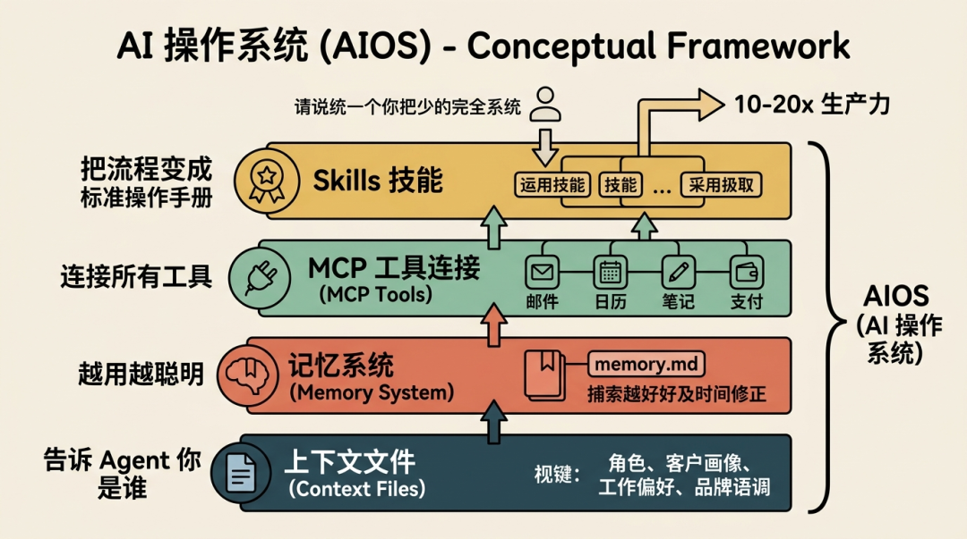 把以上所有概念串在一起,你就得到了一个完整的 AIOS(AI 操作系统) 的雏形: