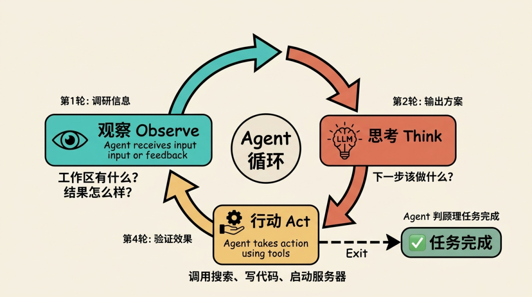 Agent 之所以能自主完成任务,靠的是一个不断重复的循环:Observe(观察)→ Think(思考)→ Act(行动)。