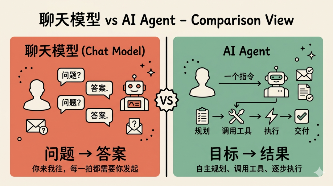 聊天模型是"问题→答案",Agent 是"目标→结果"。