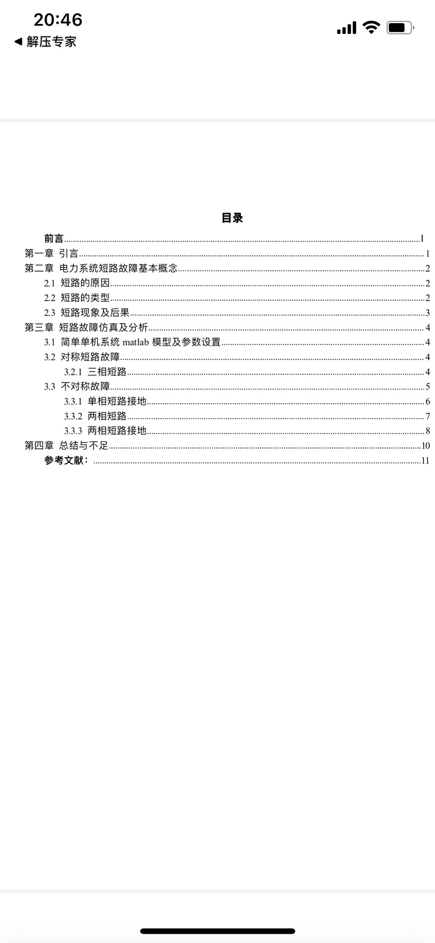 1.电力系统短路故障引起电压暂降 2.不对称短路故障分析 包括:共两份自编word+相应matlab模型 1.短路故障的发生频次以及不同类型短路故障严重程度,本文选取三类典型的不对称短路展开研究,包含单相接地短路、相间短路和两相接地短路。 文中分别计算了各类型短路故障发生时故障处三相电压变化,推导短路故障引发的暂降电压特征,使用MATLAB 进行了仿真验证。 2.主要分为四章,第一章介绍现阶段短路故障研究背景;第二章介绍了短路故障的基本概念,包括短路的原因,短路类型及短路的后果;第三章对三相短路、单相接地短路、两相短路和两相短路接地四种类型进行仿真,分析故障处和非故障处的电压、电流波形。