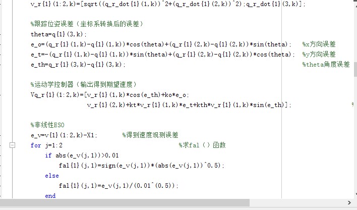 轮式移动机器人轨迹跟踪的MATHLAB程序,运用运动学和动力学模型的双闭环控制,借鉴自抗扰控制技术结合了非线性ESO,跟踪效果良好,控制和抗扰效果较优,可分享控制结构图。 这段程序主要是一个小车的动力学仿真程序,用于模拟小车在参考轨迹下的运动。下面我将对程序进行详细的分析解释。 首先,程序开始时使用`clear`、`clc`和`close all`命令来清除工作空间、命令窗口和图形窗口中的内容。 接下来,程序定义了一系列参数和变量,用于设置仿真的参数和存储仿真过程中的数据。这些参数包括小车的质量、车宽、驱动轮半径等,还有参考轨迹的振幅和频率,仿真步长,仿真时间等。 然后,程序定义了一些元胞数组,用于存储不同阶段的数据。这些数组包括参考轨迹位姿、真实运动轨迹位姿、参考轨迹一阶导数、虚拟参考轨迹速度、期望速度、真实速度、控制器输出的控制力矩、控制输入、期望速度与真实速度误差、摩擦值、外界扰动值、总扰动、位姿跟踪误差、扰动观测值等。 接下来,程序给这些变量赋初始值,包括小车的初始位姿和速度,虚拟初始速度,期望初始速度,控制器输出的控制力矩,扰动观测值等。 然后,程序进入一个循环,仿真时间从0到给定的仿真时间tf。在每个循环中,程序根据给定的参考轨迹生成圆形参考轨迹,并计算参考轨迹的一阶导数和虚拟参考轨迹速度。 接下来,程序计算位姿误差,并使用运动学控制器计算期望速度。然后,程序使用非线性ESO(Extended State Observer)估计速度扰动,并使用动力学控制器计算控制力矩。最后,程序根据控制力矩和扰动计算小车的实际速度和位姿,并计算位姿跟踪误差。 在每个循环结束时,程序更新时间和循环索引,并继续下一次循环,直到仿真时间达到设定的结束时间tf。 最后,程序绘制了多个图形来展示仿真结果。这些图形包括参考轨迹和实际运动轨迹的图像、参考轨迹角度和实际角度的图像、内环速度误差的图像、位姿跟踪误差的图像、线速度扰动和观测器估计的图像、角速度扰动和观测器估计的图像、速度曲线的图像和控制量输入的图像。 通过这些图形,可以直观地了解小车在参考轨迹下的运动情况,以及控制器的性能和位姿跟踪误差等。 这段程序涉及到的知识点包括动力学方程、参考轨迹生成、运动学控制器、非线性ESO、动力学控制器等。它主要用于解决小车在给定参考轨迹下的运动控制问题,通过控制器输出的控制力矩来控制小车的速度和位姿,以实现对参考轨迹的跟踪。