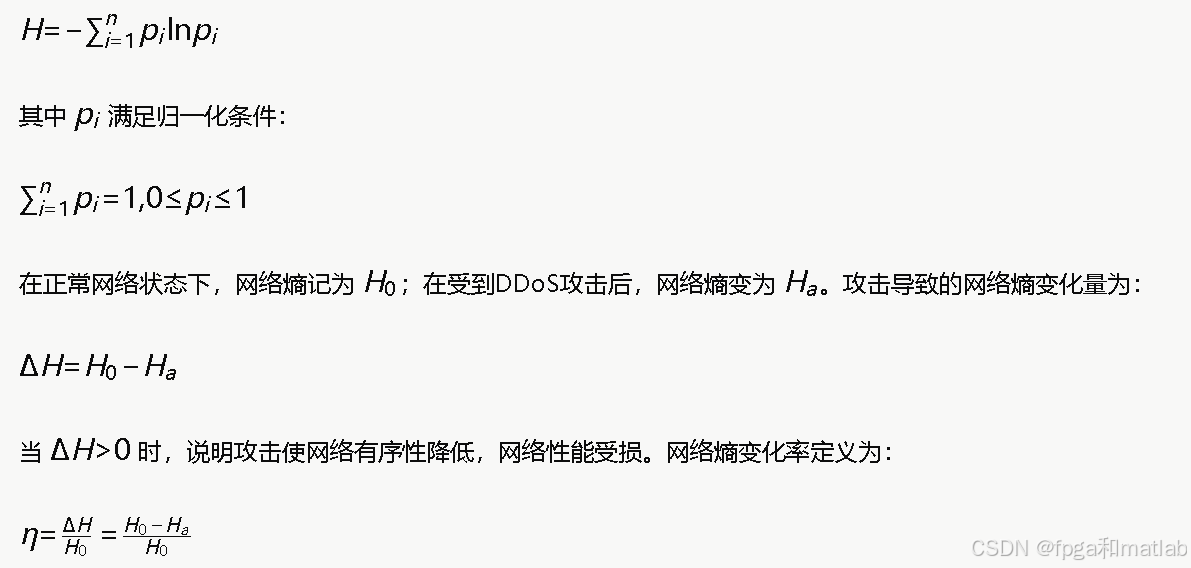 网络熵是衡量网络状态有序程度的重要指标。在DDoS攻击场景中,正常网络流量的分布具有一定的规律性,而攻击流量的注入会导致网络流量分布发生显著变化,从而引起网络熵的变化。设网络中存在 nn 种不同类型的流量,第i种流量占总流量的比例为pi,则网络熵定义为: