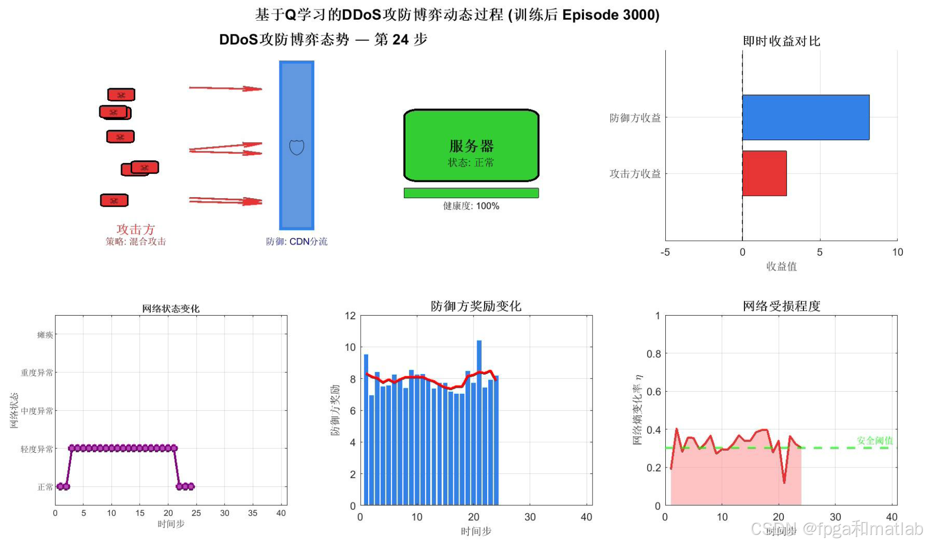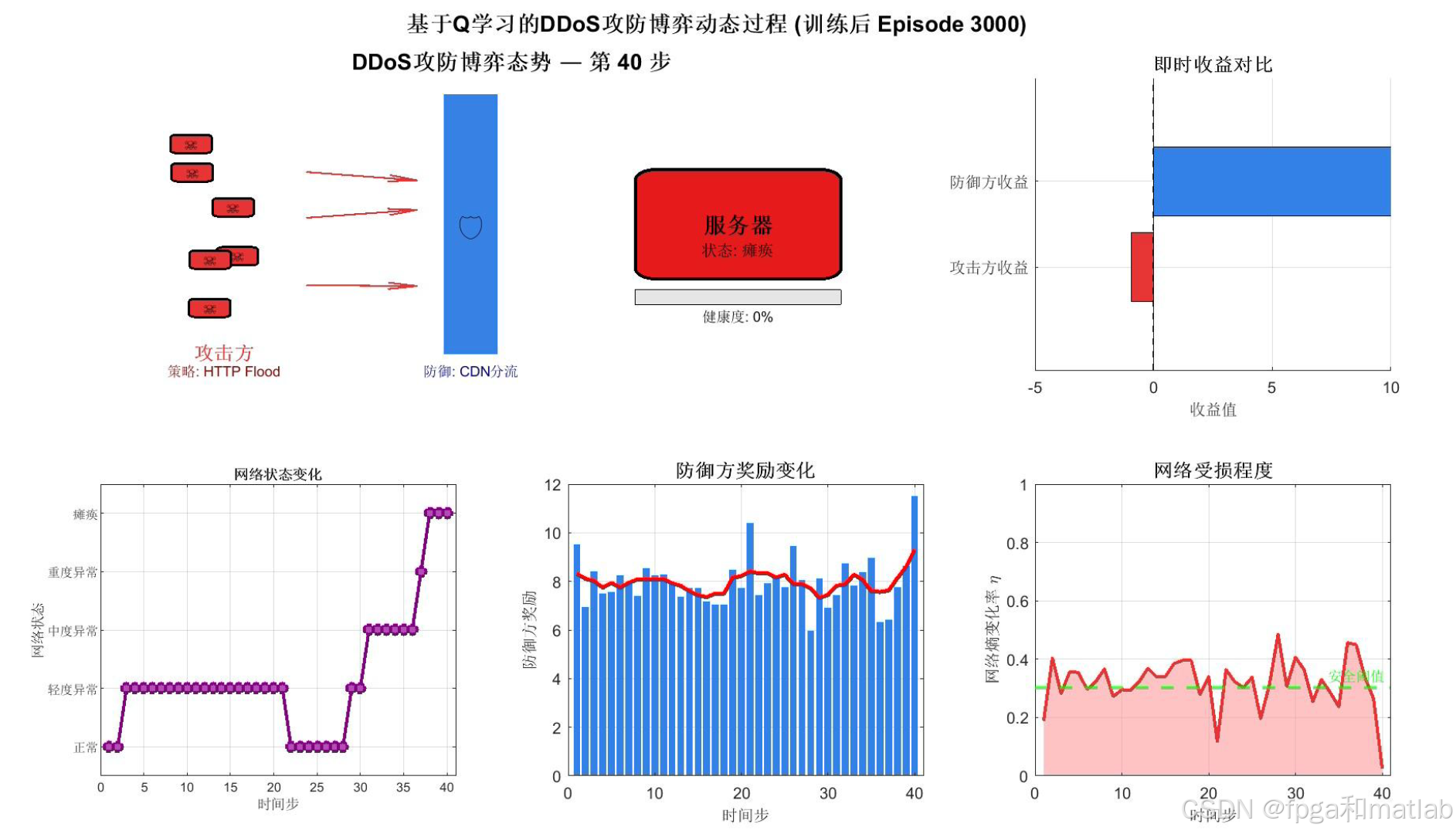 这是整个仿真最核心的可视化输出,动态展示训练完成后的攻防博弈过程。画面分为六个区域:左上方展示网络拓扑态势图,攻击方(红色僵尸节点)向服务器发起攻击,中间的防御墙颜色深浅反映防御效果,服务器颜色由绿到红反映健康状态;右上方实时对比攻防双方收益;下方三个子图分别展示网络状态时间序列、防御方奖励柱状图和网络熵变化率面积图。