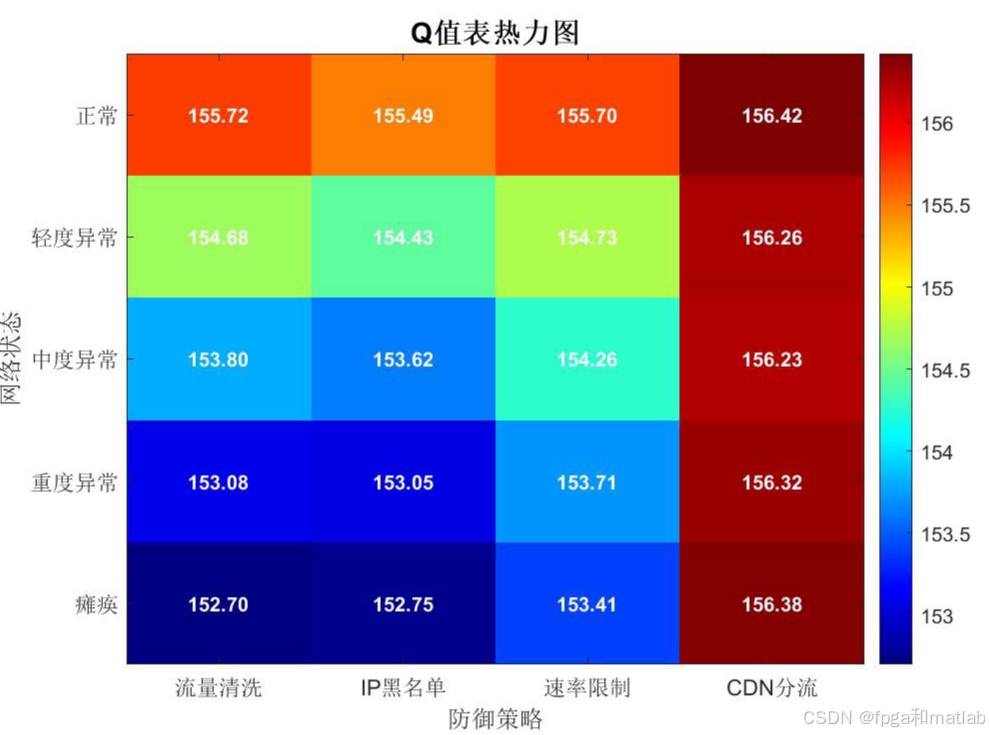 以颜色深浅直观呈现各状态-动作对的Q值大小,热力图中每个格子内标注了具体数值,清晰展示不同网络状态下的最优防御策略选择。