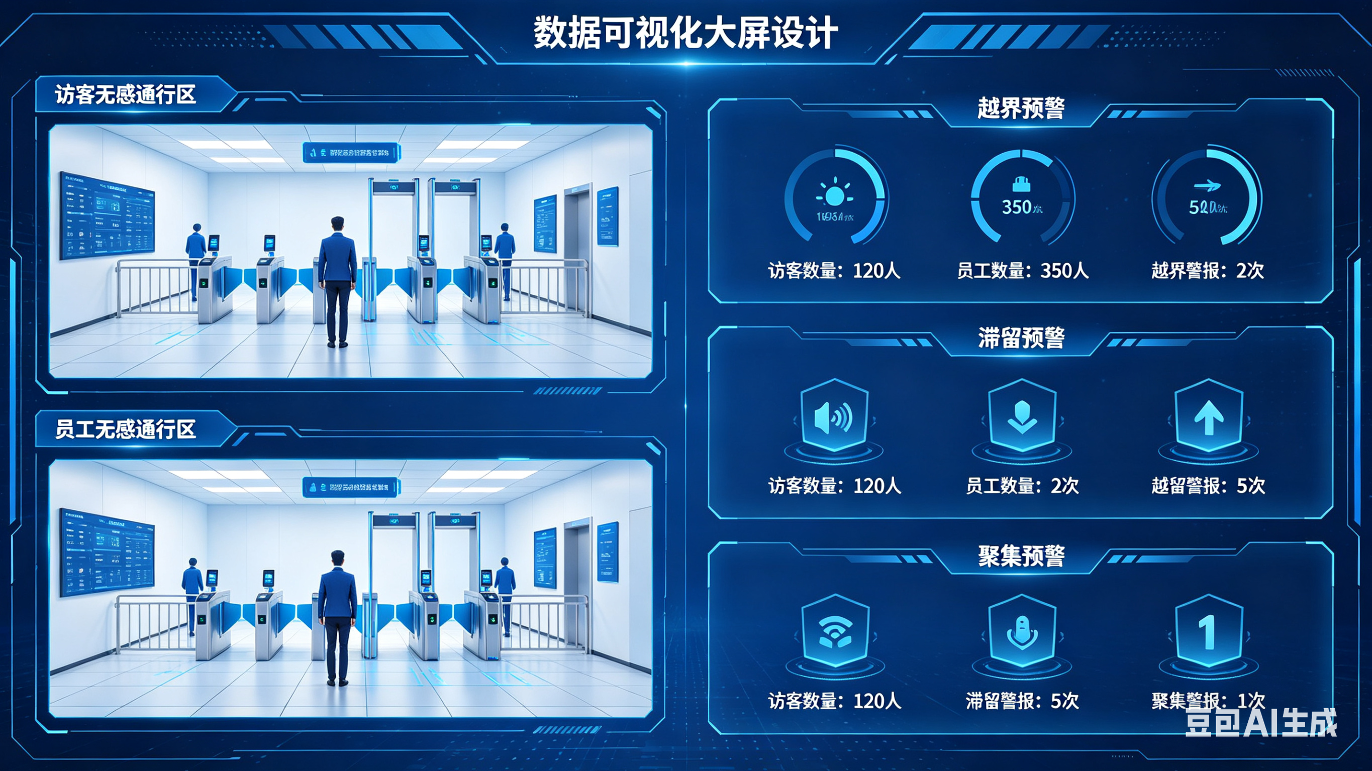3. 算法层:搭载AI视觉识别算法、人员轨迹分析算法、异常行为判定算法、数字孪生渲染算法,实现人员身份核验、无感通行、行为智能研判。
