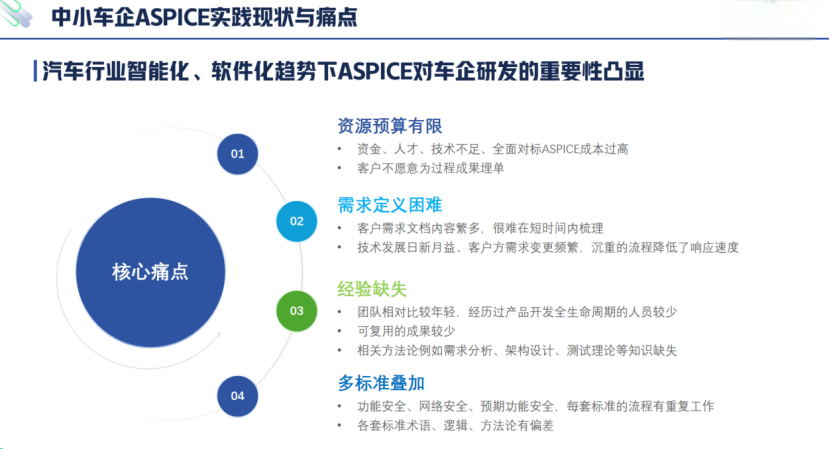 - 其四是资源预算有限,资金、人才、技术储备不足,全面对标 ASPICE 的成本过高,同时市场对研发过程成果的付费意愿低,企业难以实现成本回收