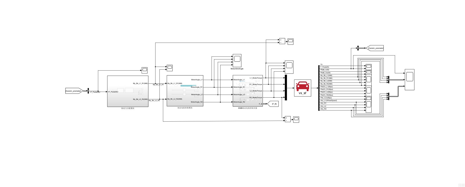 玩过Carsim的朋友都知道,液压制动系统建模是自带黑盒子——能跑但改不动。今天咱们换个思路,用四个无刷电机直接怼在车轮上搞线控制动,这才是真·硬核玩家的打开方式。